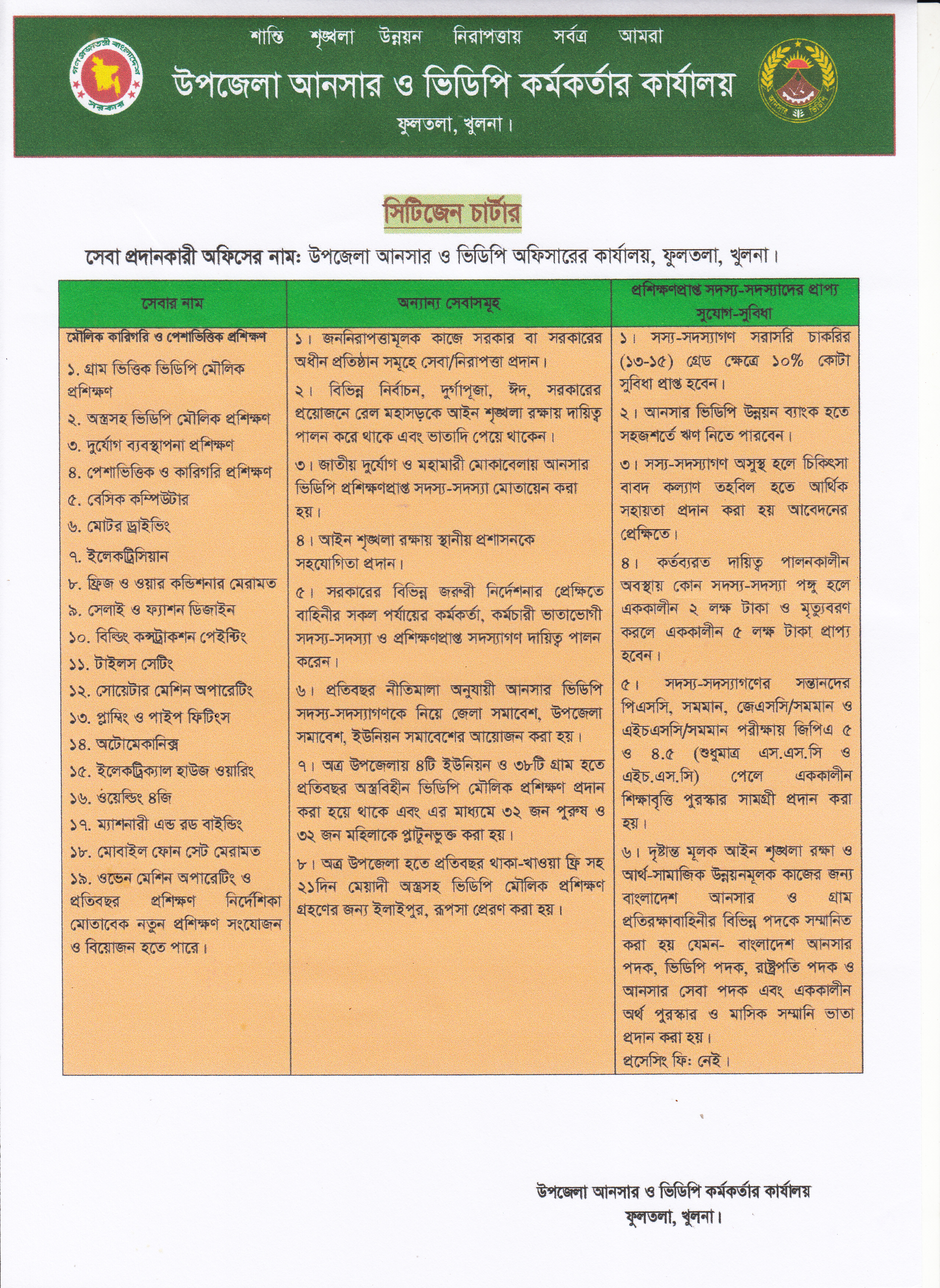 | ২(খ) | উপজেলা আনসার-ভিডিপি অফিসারের অফিস | জাতীয় জরুরী প্রয়াজনে নিবার্হী আদেশবলে যেমন দূগার্পুজা, নিবার্চন (জাতীয়, স্থানীয় সরকার), এস এস সি পরীক্ষা, দূযোর্গ মোকাবেলা ইত্যাদিতে স্বল্প মেয়াদে আনসার অঙ্গীভূতকরণ | ১। জেলা কমান্ড্যান্ট ২। উপজেলা আনসার ভিডিপি কমর্কর্তা | আদেশপত্র প্রাপ্তি সাপেক্ষে প্লাটুনভুক্ত আনসার-ভিডিপি সদস্যদের মধ্য হতে চাহিত সংখ্যক আনসার ১/২/৩/৪/৫/ দিনের জন্য জেলা কমান্ড্যান্ট কখনো কখনো উপজেলা আনসার ভিডিপি কমর্কর্তা দৈনিক ১৮০ (এক শত আশি) টাকা ভাতায় আনসার অঙ্গীভূত করেন। | প্রত্যাশিত সংস্থার চাহিদাসাপেক্ষে | চাহিত সরকারী/বেসরকারী সংস্থা হতে জন প্রতি দৈনিক ১৮০ (এক শত আশি) টাকা হিসেবে
